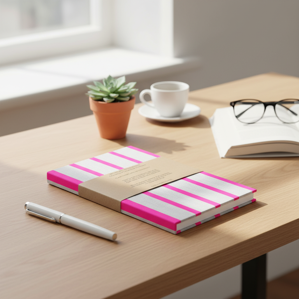 Upcycled A5 Notebook using reused coffee cups & Repurposed Linen Off-cut "Embrace Your Stripes" print