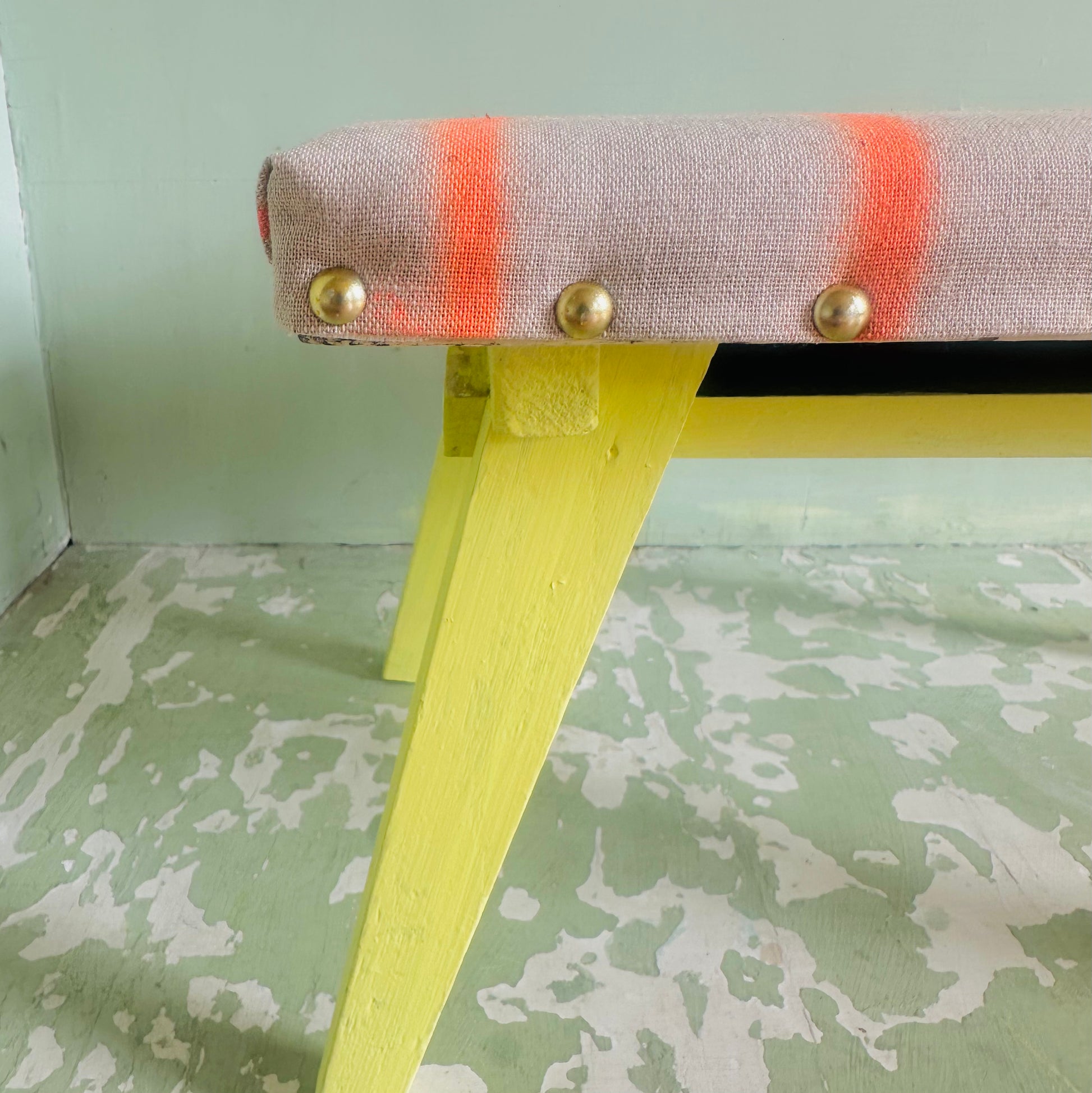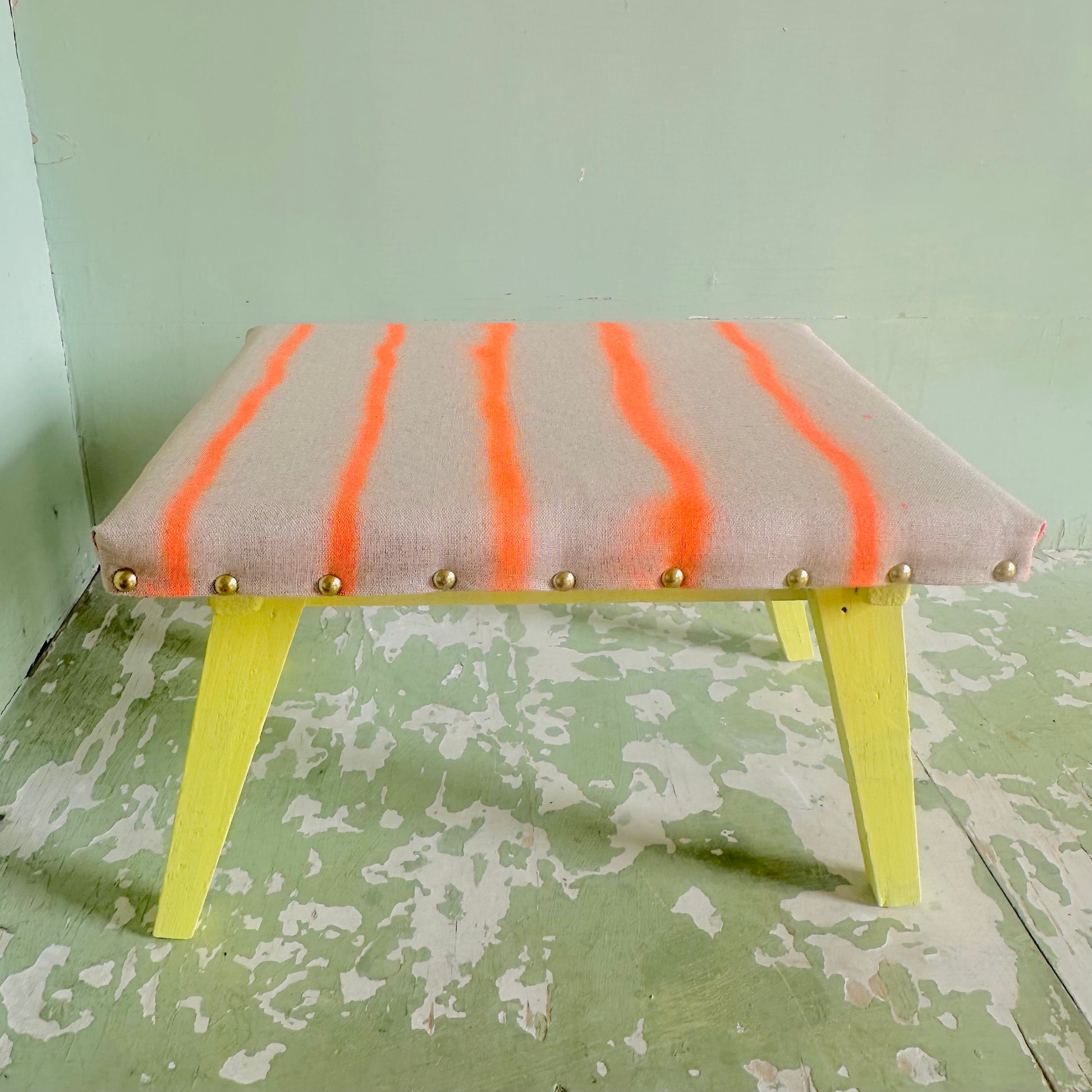 This re-purposed vintage stool has been re-upholstered using a free-hand illustrated print 'Embrace Your Stripes' using eco-friendly spray paint on a neutral luxurious linen base fabric. Finished with contrasting gold brass studs.
